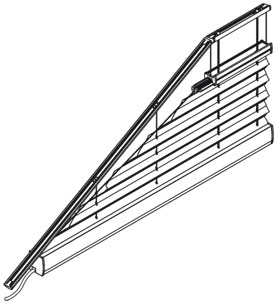 Verspannte Anlage für trapezförmige Plafondfenster oder Lichtkuppeln, Neigung von 45° vertikal bis 90° horizontal,mit 24 V Elektromotor, 1-seitige Schräge, schmale Breite oben. Die Aufziehtechnik(Motor,etc.) ist in der Unterschiene. Permanente Mehrfachverspannung durch UV-beständigen grauen Stahldraht im Abstand von ca. 25 cm. Stoff ist an der Unterschiene befestigt und wird von unten nach oben gezogen.